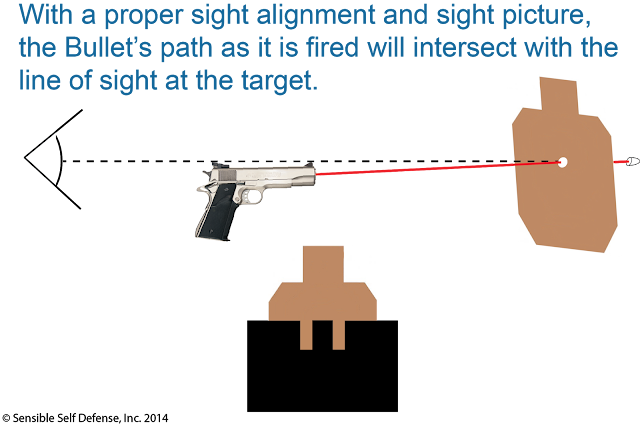the aligned sights and the goal — what you see the moment the pistol fires.